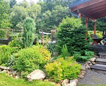 80 metrowy taras z meblami ogrodowymi oraz leżakami jest doskonałym miejscem do relaksu lub spożywania posiłków na świeżym powietrzu podziwiając jednocześnie widok na las. W urozmaiconym 85 aromwym ogrodzie znajduje się duży plac zabaw dla dzieci, miejśce na ognisko, grilla, ławeczka przy potoku i piękna duża łąka.